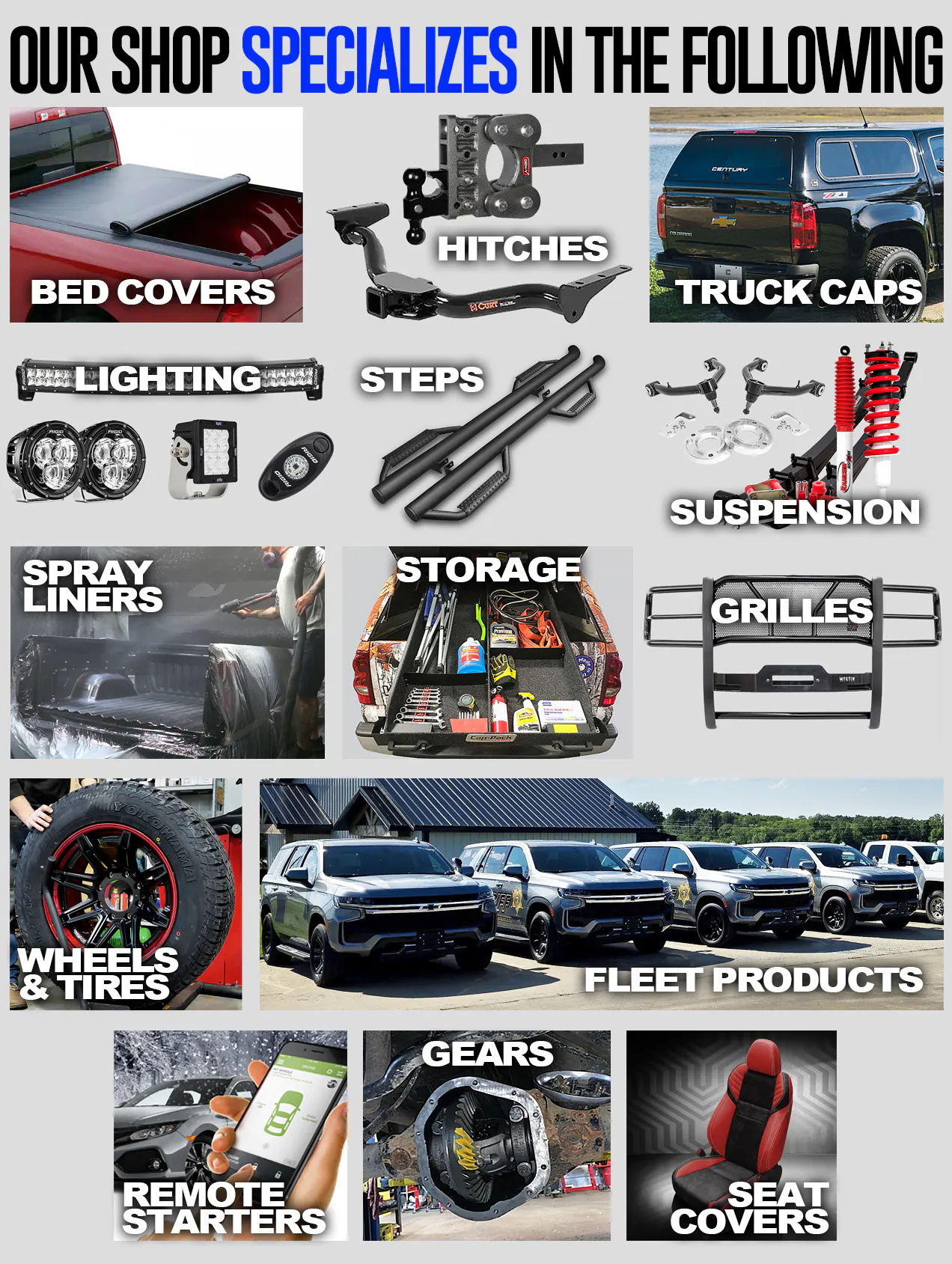 Our local shop specializes in Tonneau Covers, Truck Caps, Running Boards, Trailer Hitches, Suspension, Wheels, Tires, etc.